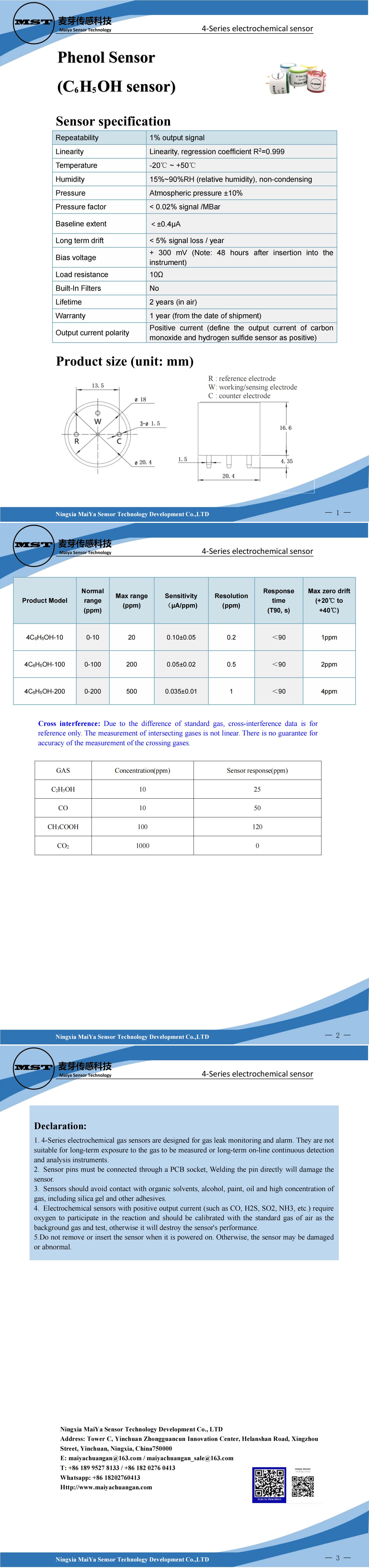 4-Series electrochemical gas sensors are designed for gas leak monitoring and alarm. They are not suitable for long-term exposure to the gas to be measured or long-term on-line continuous detection and analysis instruments.