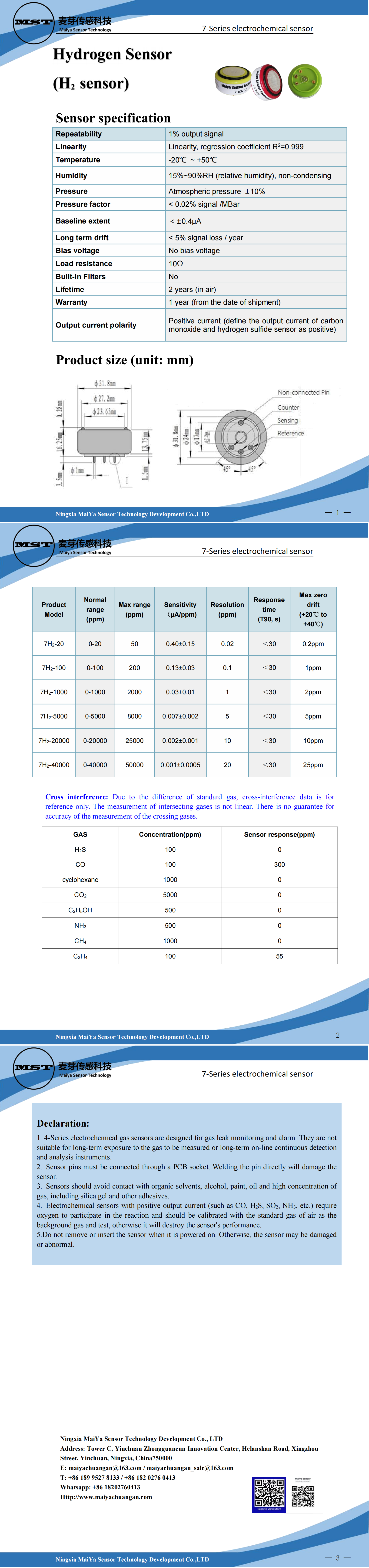 7-Series electrochemical gas sensors are designed for gas leak monitoring and alarm. They are not suitable for long-term exposure to the gas to be measured or long-term on-line continuous detection and analysis instruments.
