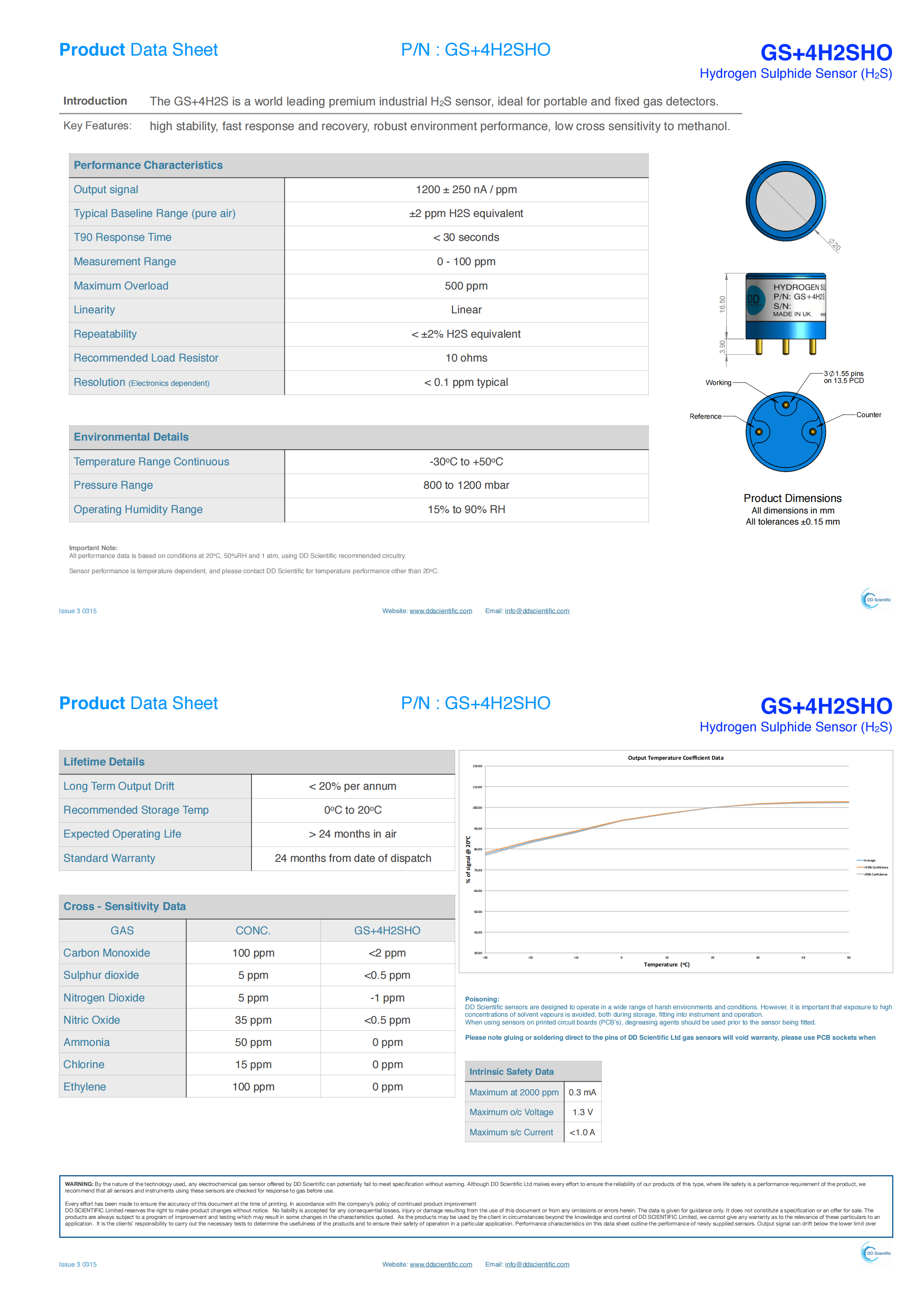 The GS+4H2S is a world leading premium industrial H2S sensor, ideal for portable and fixed gas detectors. Key Features: high stability, fast response and recovery, robust environment performance, low cross sensitivity to methanol.