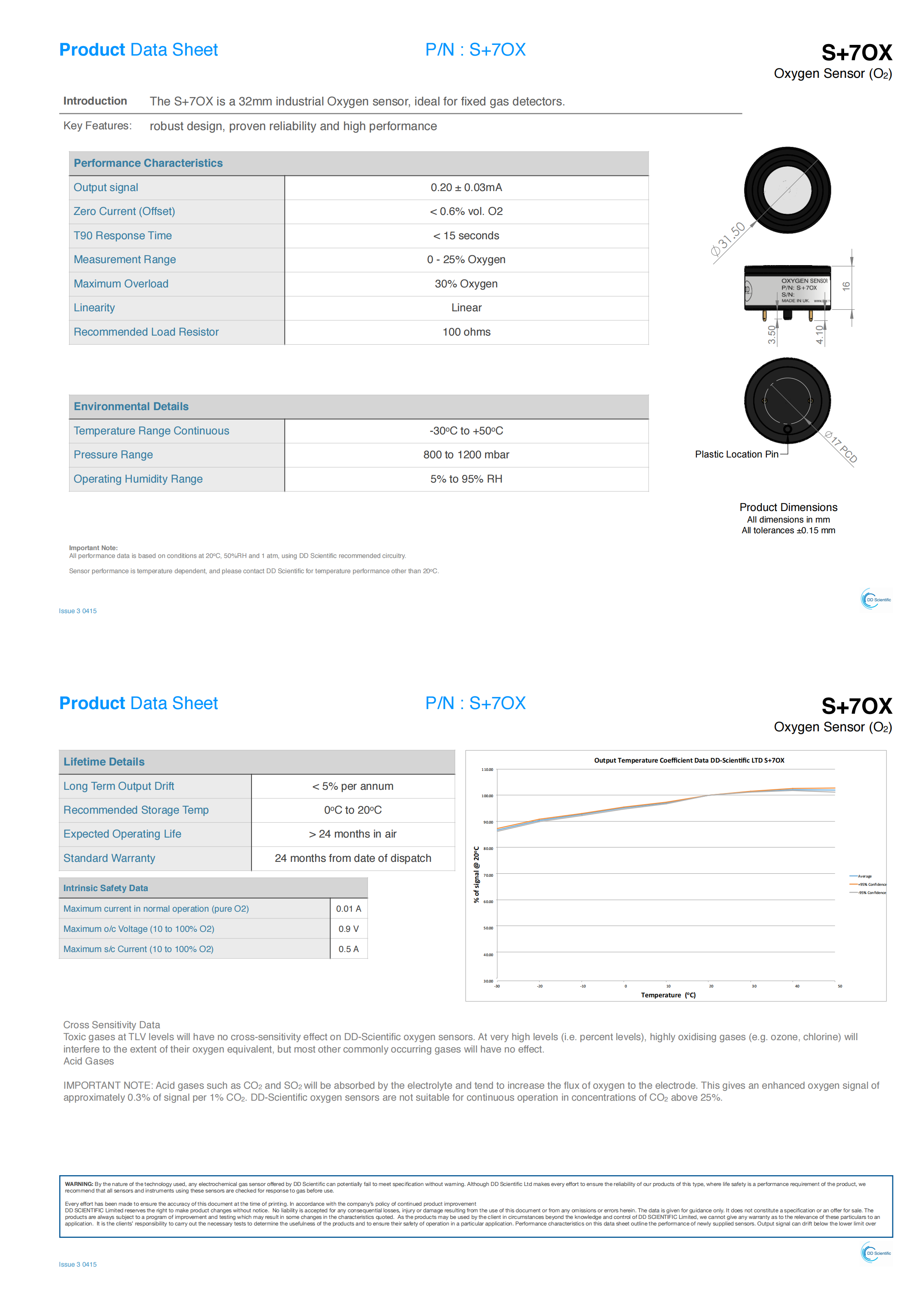 The S+7OX is a 32mm industrial Oxygen sensor, ideal for fixed gas detectors. Key Features: robust design, proven reliability and high performance