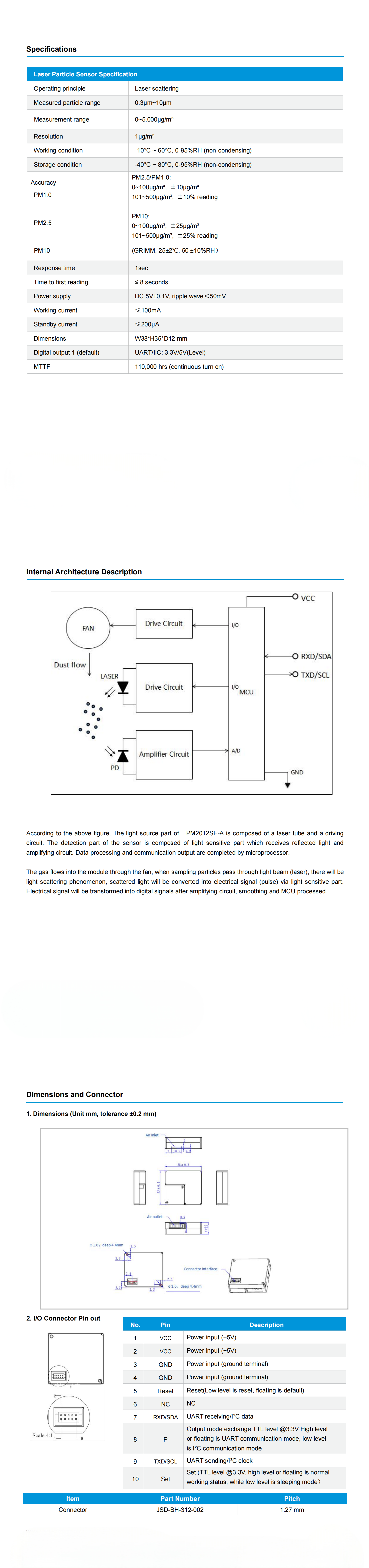 Three-Channel Output - PM1.0, PM2.5, PM10 Particle Counting Output - 0.3μm, 0.5μm, 1.0μm, 2.5μm, 5.0μm, 10μm Auto Particle Identification allows the sensor to "switch" between calibration algorithms based on changing application needs Matrix calibration provides high accuracy throughout the working temperature and measurement range Constant speed fan and constant power diode maintain measurement accuracy and stability