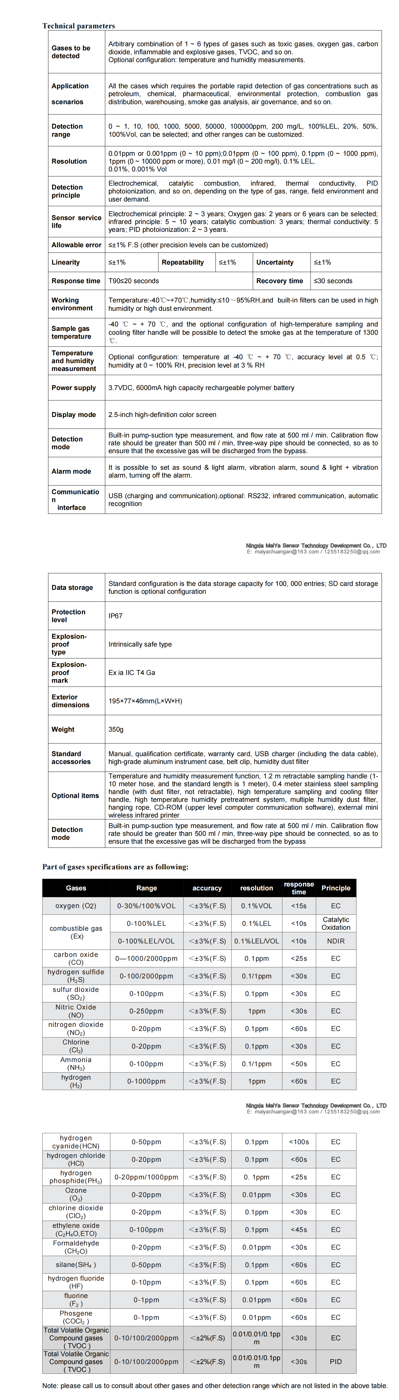 The portable composite gas detector can be used in: mobile rapid and accurate detection of a variety of gas concentration and measurement of environmental temperature and humidity, if the measurement exceeded the limit value, the alarm will sound. adopted 2.5-inch high-definition color screen for real-time display, adopted the gas sensors of internationally well-known brands, and the main detection principles include: electrochemical, infrared, catalytic combustion, thermal conductivity, PID photoionization, and so on. Adopted Swiss high-precision capacitive digital temperature and humidity sensors. Advanced electric circuit design, mature kernel algorithm processing, unique external appearance design, had achieved a number of patents about the software works, external appearance, and so on. is suitable for detecting the concentrations of gases in the atmosphere environment in the pipeline or confined space; and the purity of the gas leakage and various high concentration single gases with the background gas as nitrogen gas or oxygen gas. The types for detection are more than 500 types.